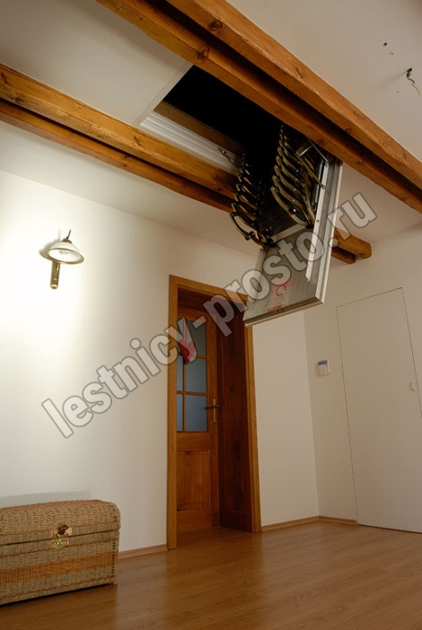Крышка лестницы представляет собой многослойную конструкцию - деревянная рама, внутри которой находится пенопласт. Внутренняя часть крышки покрыта оцинкованной жестью, наружная часть белой эмалью и защитной пленкой. Толщина крышки 60 мм. Все соединяющие части изготовлены из твердого материала и имеют оцинкованное покрытие. Короб металлический высотой 140 мм., по периметру проходит уплотнитель. Ступени лестницы изготовлены из анодированной стали и покрыты порошковой краской, поверхность имеет антискользящие насечки и выдерживают нагрузку 150 кг.