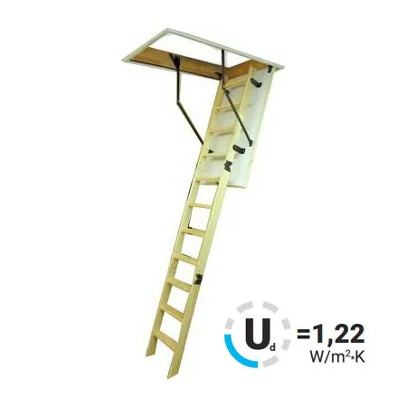 Лестница обладает повышенной теплоизоляцией и низкими показателями воздухопроницаемости крышки. Облегченная крышка люка изготовлена из пенополистирола без применения дополнительных деревянных элементов. Наконечники имеют возможность регулировки, что позволяет подогнать длину лестницы по высоте помещения в случае излишнего подрезания лестницы или изменения толщины пола.