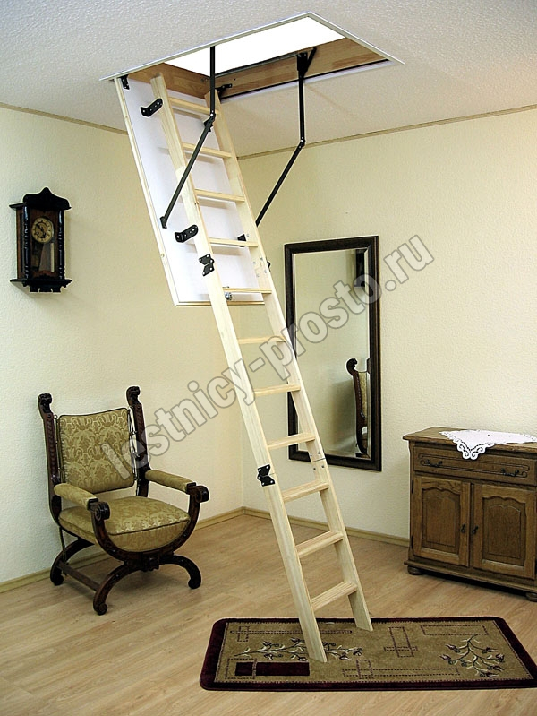 Лестница складная трёхсекционная, изготовлена из сосны. Термоизоляционная крышка типа "сэндвич" утеплена пенопластом, облицована с двух сторон ДСП белого цвета. Короб люка с однослойным уплотнителем. Все металлические элементы лестницы покрыты порошковой краской, ступени лестницы имеют антискользящие насечки и закреплены в столярное соединение «ласточкин хвост», что позволяет выдерживать нагрузку до 150 кг. Деревянный стержень для открывания лестницы в комплекте.