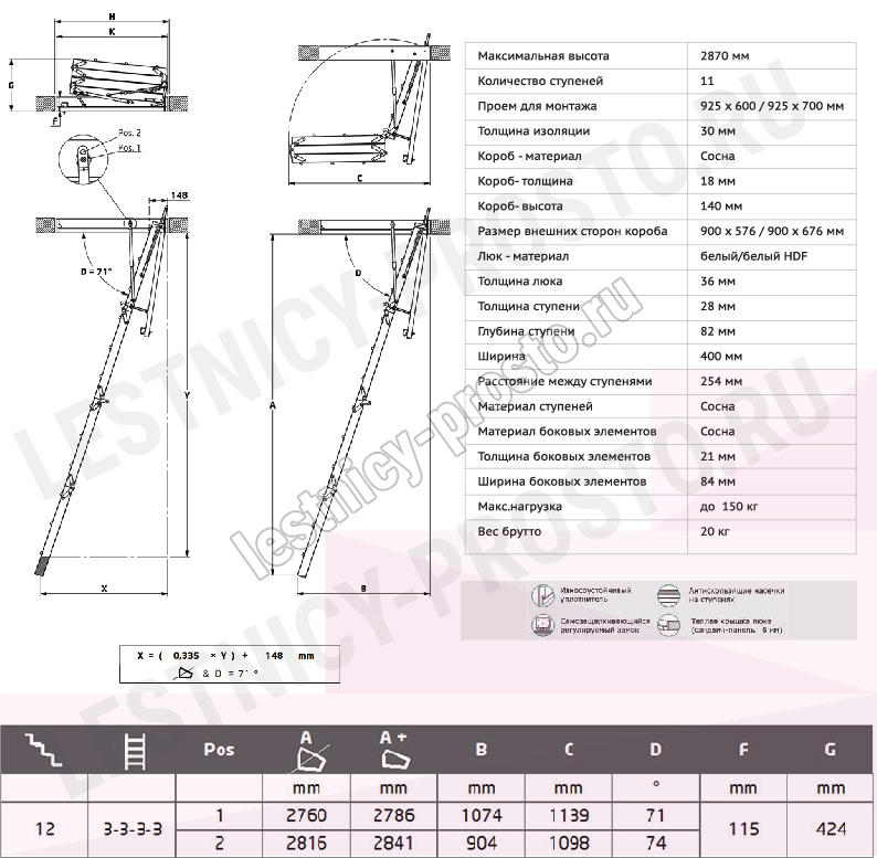 На ступенях лестницы антискользящие насечки. Люк с двух сторон облицован ДСП белого цвета. Размер короба: 900 × 576 мм