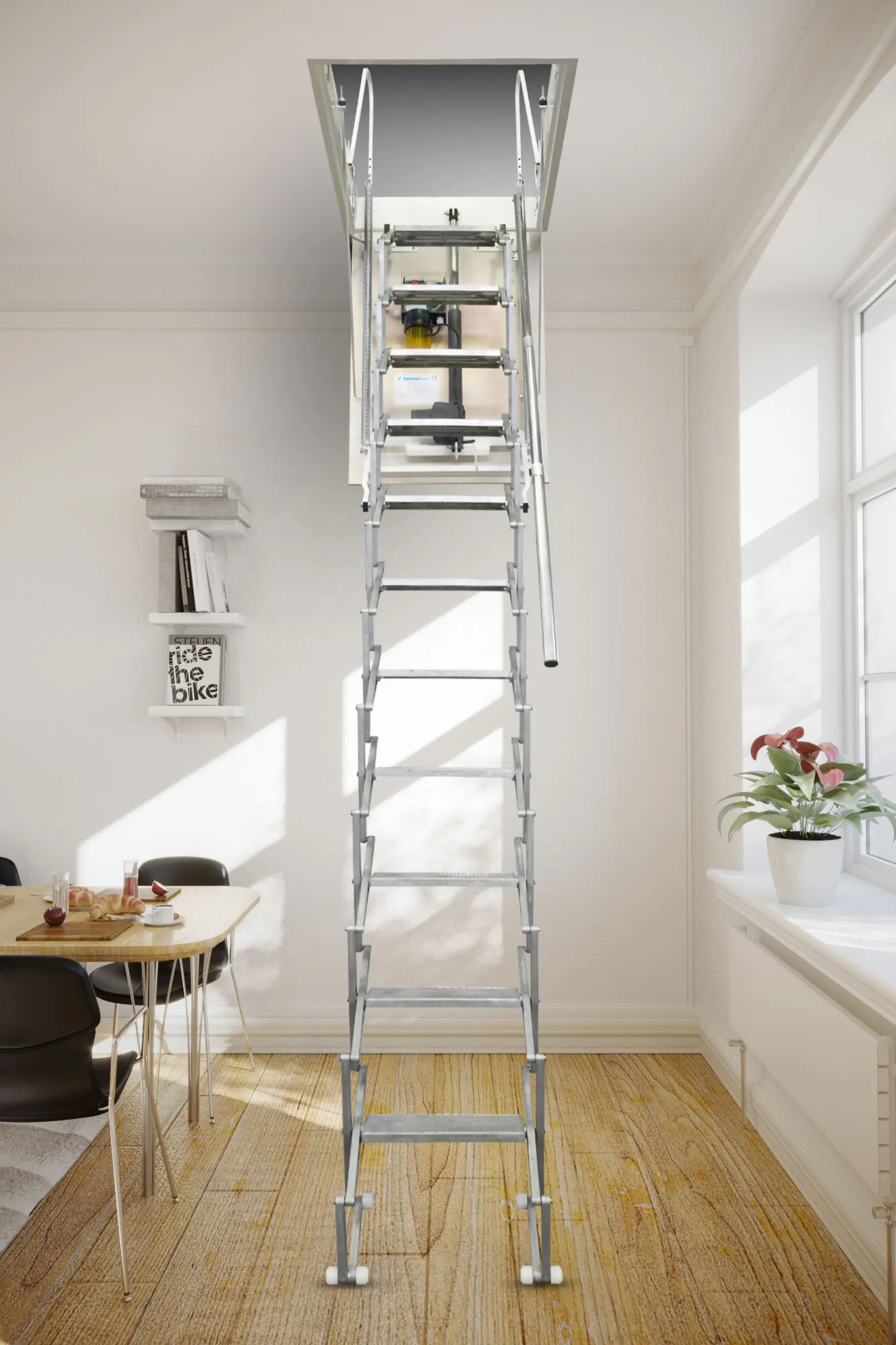 Все элементы лестницы выполнены из экологически чистых материалов и обработаны веществами, не содержащими тяжелых металлов. На ступенях антискользящие насечки. Короб лестницы изготовлен из металла. Термоизоляционная крышка типа "сэндвич" утеплена пенопластом, облицована с двух сторон ДСП белого цвета. Короб люка с уплотнителем. В комплекте деревянный стержень для открывания лестницы.