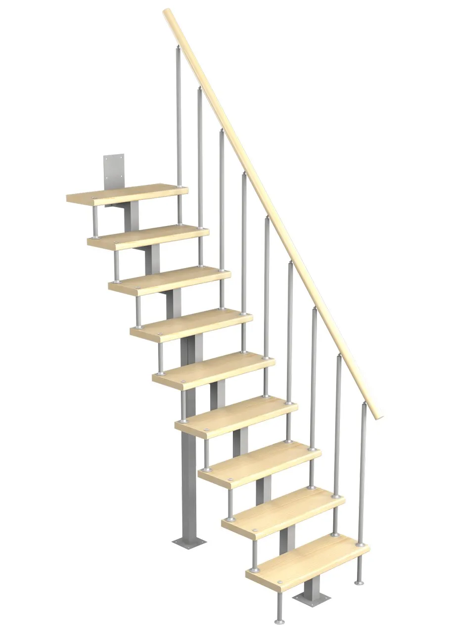 Удобная поворотная лестница на второй этаж. Дополнительные ограждения по первому маршу обеспечивают безопасность при подъеме и спуске, кроме того, небольшой угол подъема открывает всю площадь ступеней. Монтаж осуществляется силами двух человек на объекте по указаниям, приведенным в паспорте на лестницу.