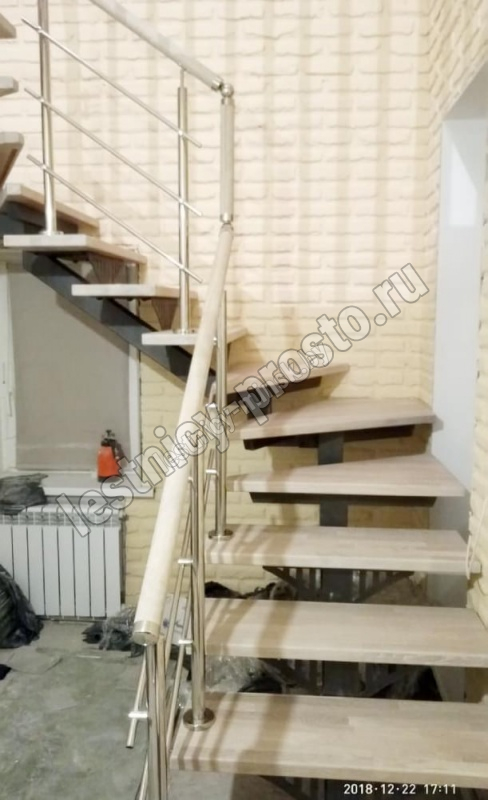 В комплекте буковый поручень, диаметром 50 мм. без какого либо покрытия, стойки из нержавеющей стали (устанавливаются через 1 ступень), диаметром 38 мм,