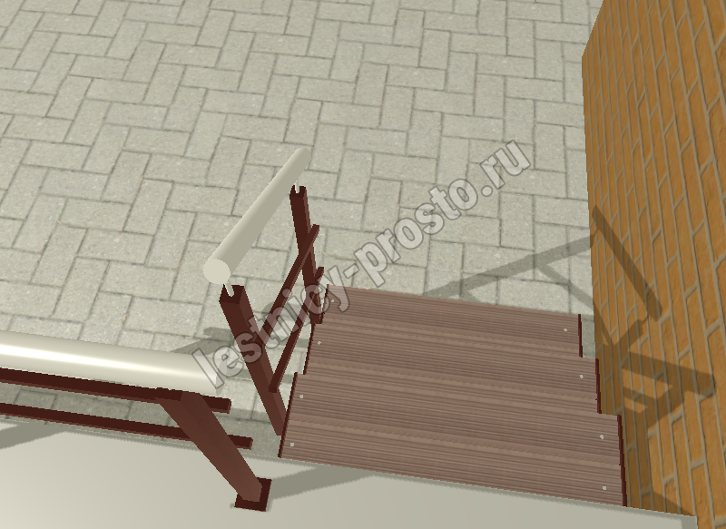 Ступени лестницы состоят из металлической рамки, обеспечивающей необходимую прочность, и покрытия из террасной доски ДПК (древесно-полимерный композит). Ступени не боятся воды и мороза, не теряют со временем свой внешний вид и не требуют ухода.