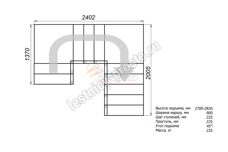 Модульная лестница Комфорт 225 2700-2820, Белый, Бук, Нержавеющая сталь