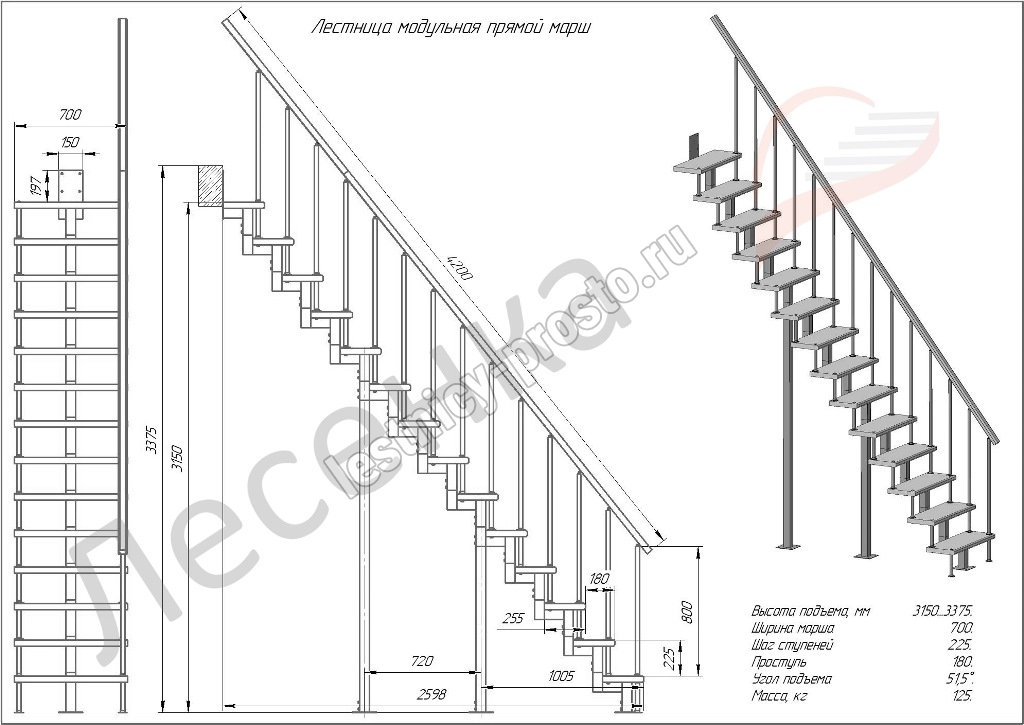 Модульная малогабаритная лестница Линия 3150-3375, Черный, Сосна, Крашеная, Без Ступений