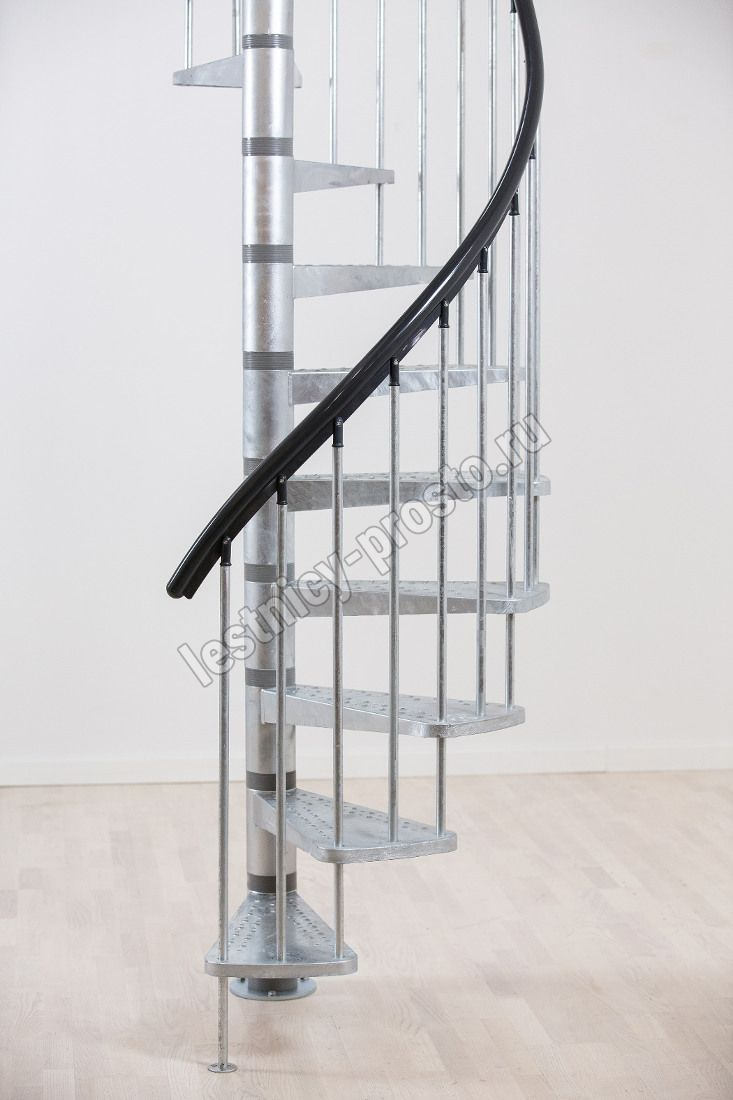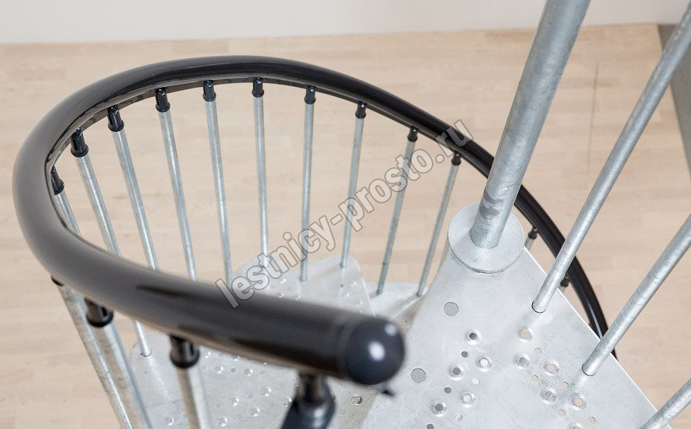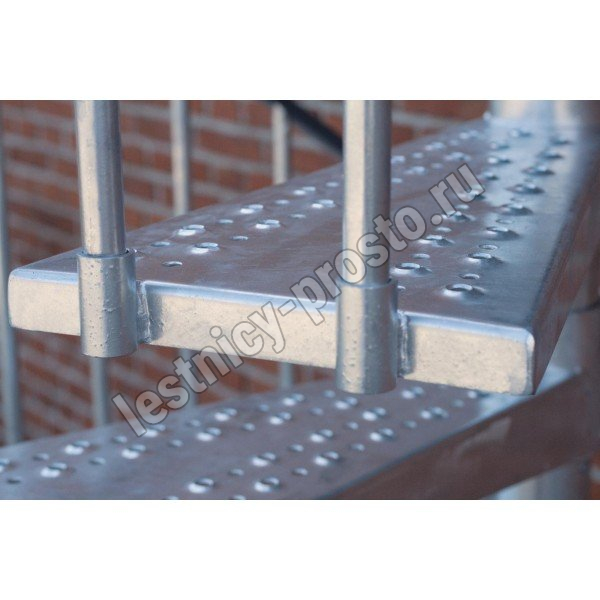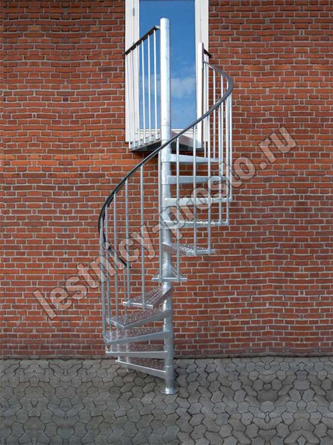 Металлическая винтовая лестница с металлическим поручнем и площадкой. Лестница монтируется как по часовой стрелке, так и против нее. Предназначена для использования внутри помещения или снаружи. На ступенях противоскользящие насечки. Лестница изготовлена из оцинкованной стали.