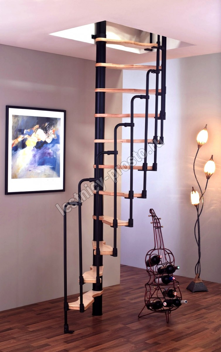 Компактная надёжная лестница. Ступени толщиной 30 мм, изготовлены из массива берёзы по технологии Multiplex, лакированные. Все металлические части оцинкованы, горячим способом и покрыты порошковой краской - черного цвета; Лестница имеет надёжную несущую стальную конструкцию.